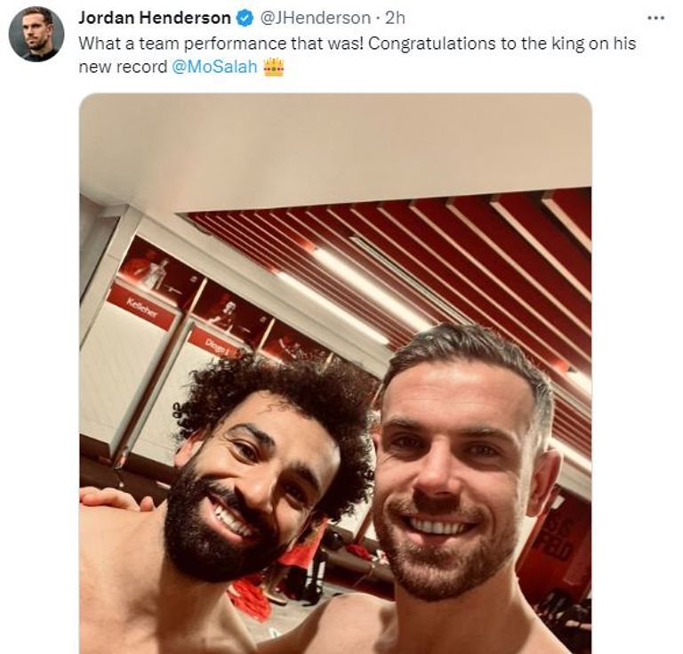 ونشر هندرسون صورة تجمعه بـ محمد صلاح بعد المباراة، وعلَّق عليها قائلا: "يا له من أداء للفريق، تهانينا للملك على رقمه القياسي الجديد".