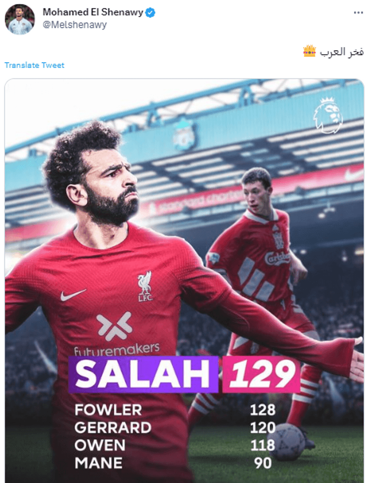 ونشر اتحاد الكرة المصري صورة لصاحب الـ30 عاما عبر صفحته الرسمية بموقع التواصل الاجتماعي "فيسبوك"، وعلق عليها قائلا: "الملك المصري محمد صلاح الهداف التاريخي لليفربول في الدوري الإنجليزي الممتاز".