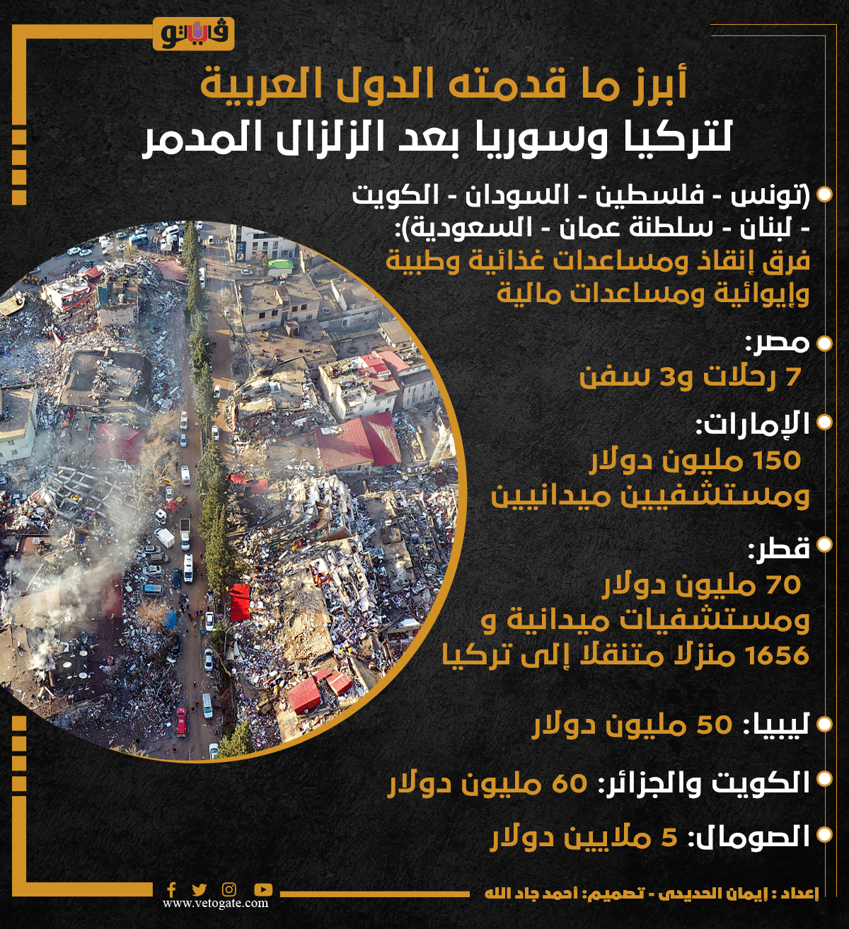 أبرز ما قدمته الدول العربية لتركيا وسوريا بعد الزلزال المدمر (إنفوجراف) الثلاثاء 07/مارس/2023 - 12:43 م 3/7/2023 12:43:22 PM زلزال تركيا، فيتو إيمان الحديدى شارك طباعة 18 حجم الخط شارك طباعة الزلزال المدمر تركيا السودان الدول العربية كارثة الزلزال