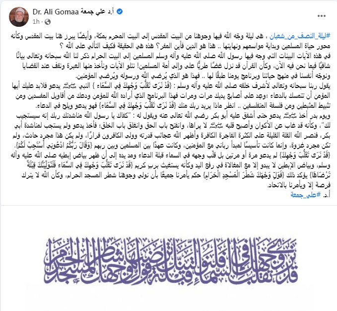 وعن ليلة النصف من شعبان، قال الدكتور علي جمعة: "هى ليلة وجّه الله فيها وجوهنا من البيت المقدس إلى البيت المحرم بمكة، وأيضًا يبرز هنا بيت المقدس وكأنه محور حياة المسلمين وبداية مواسمهم ونهايتها.. هذا هو الدين فأين المفر؟ هذه هي الحقيقة فكيف التألي على الله؟".