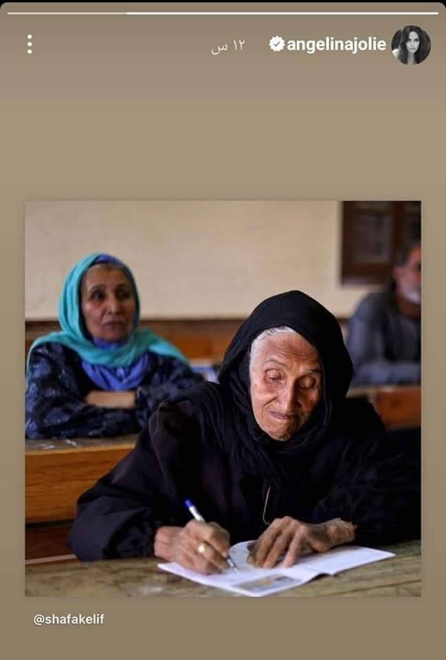 في وقت سابق، قالت الحاجة زبيدة عبد العال، أكبر حاصلة على شهادة محو الأمية في مصر بعد حديث النجمة العالمية نشر أنجلينا جولي عنها ونشرها لصورتها علي حالة موقع التواصل الاجتماعي "إنستجرام"، إنها سعدت بعد معرفتها للخبر.