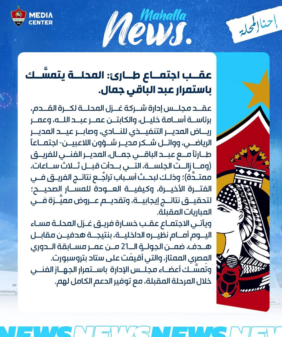 أعلن مجلس إدارة نادي غزل المحلة في بيان رسمي تمسكهم باستمرار الجهاز الفني للفريق بقيادة عبد الباقي جمال، وتجهيز اجتماع طارئ لمناقشة أسباب النتائج المخيبة الفترة الماضية.