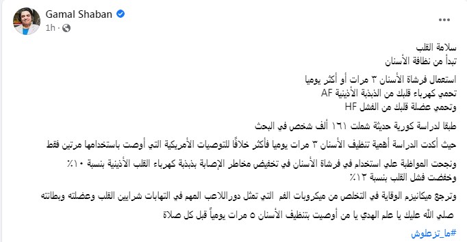 وقال الدكتور جمال شعبان عن علاقة تنظيف الأسنان وأمراض القلب، عبر حسابه بالفيس بوك: "سلامة القلب.. تبدأ من نظافة الأسنان.. استعمال فرشاة الأسنان ٣ مرات أو أكثر يوميا، تحمي كهرباء قلبك من الذبذبة الأذينية AF، وتحمي عضلة قلبك من الفشل HF"