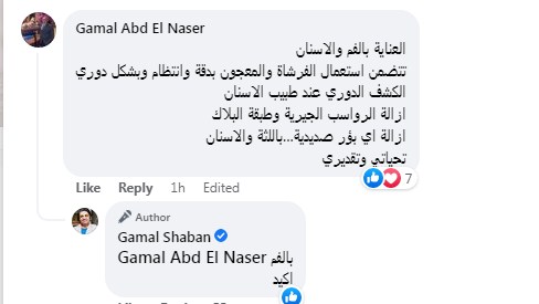 وعلق طبيب الأسنان الدكتور جمال عبد الناصر فقال "العناية بالفم والأسنان تتضمن استعمال الفرشاة والمعجون بدقة وانتظام وبشكل دوري، الكشف الدوري عند طبيب الاسنان، وازالة الرواسب الجيرية وطبقة البلاك، وإزالة أي بؤر صديدية...باللثة والأسنان"