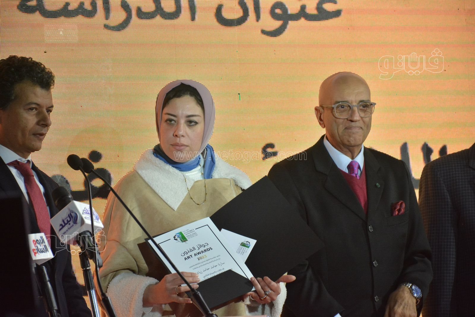 وبدأ الحفل بافتتاح وزيرة الثقافة الدكتورة نيفين الكيلاني يرافقها الفنان فاروق حسني معرض للأعمال المشاركة في الدورة الرابعة من جوائز فاروق حسني للثقافة والفنون.