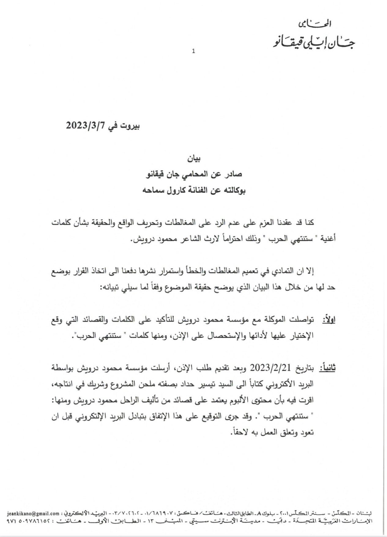 ونشرت كارول سماحة بيانا على لسان محاميها يؤكد أنها استأذنت ورثة الشاعر محمود درويش التعاون باستخدام بعض قصائده في الألبوم، ووافقت مؤسسة محمود درويش وأذنت لها.
