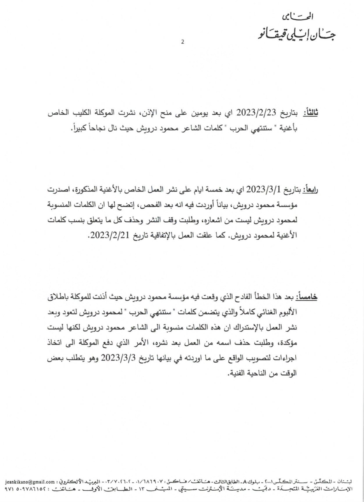 وأضاف البيان: "هناك مقطع وحيد مجتزأ من قصيدة محمود درويش "وعاد في كفن" وجرى تحريفه واستخدامه في الأغنية بينما يرد في النص الأصلي، "يحكون في بلادنا... يحكون في شجن". وبعد التدقيق في ذلك الفيديو والإعلان المرافق له طلبت المؤسسة رسميًّا من الفنانة كارول سماحة وشركائها في الإنتاج، وقف النشر وحذف كل ما يتعلق بنسب كلمات الأغنية لمحمود درويش.
