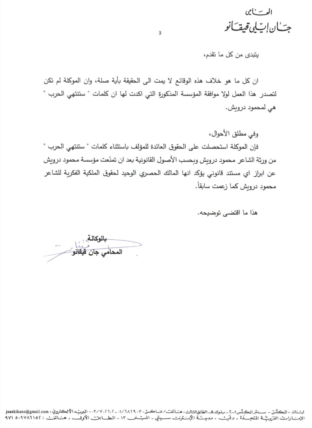 وطالبت مؤسسة محمود درويش من المطربة اللبنانية كارول سماحة بالتزام توقف نشر وحذف القصيدة المنسوبة لاسم الراحل محمود درويش.
