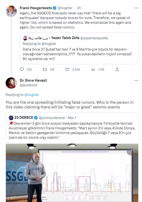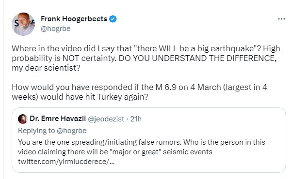 ليأتي رد فرانك هوجربتس قائلًا: "في الفيديو أين قلت أنه "سيكون هناك زلزال كبير"؟ هناك احتمالية عالية ليست مؤكدة. هل تفهم الفرق يا عالم يا عزيز؟ كيف سيكون رد فعلك إذا ضرب زلزال بقوة 6.9 ريختر في مارس تركيا مرة أخرى؟"