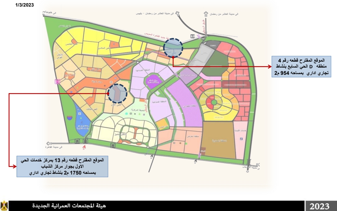 الموقع المقترح قطعة رقم 13 بمركز خدمات الحي الأول بجوار مركز الشباب بمساحة 1750 م2 بنشاط تجاري إداري وسعرها التقديري 10640 جنيه مصري للمتر مربع.