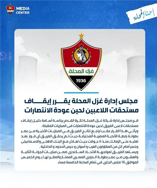 قرر مجلس إدارة نادى غزل المحلة برئاسة أسامة خليل إيقاف مستحقات لاعبي الفريق الأول بسبب النتائج المخيبة الفترة الماضية في بطولة الدوري المصري الممتاز.