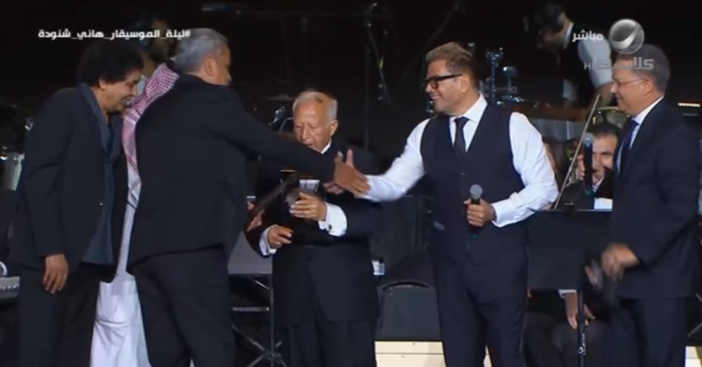 أشعل الهضبة عمرو دياب حفل تكريم الموسيقار هاني شنودة على مسرح أبو بكر سالم بالمملكة العربية السعودية بباقة من أغانيه الشهيرة وسط تفاعل الحضور.
