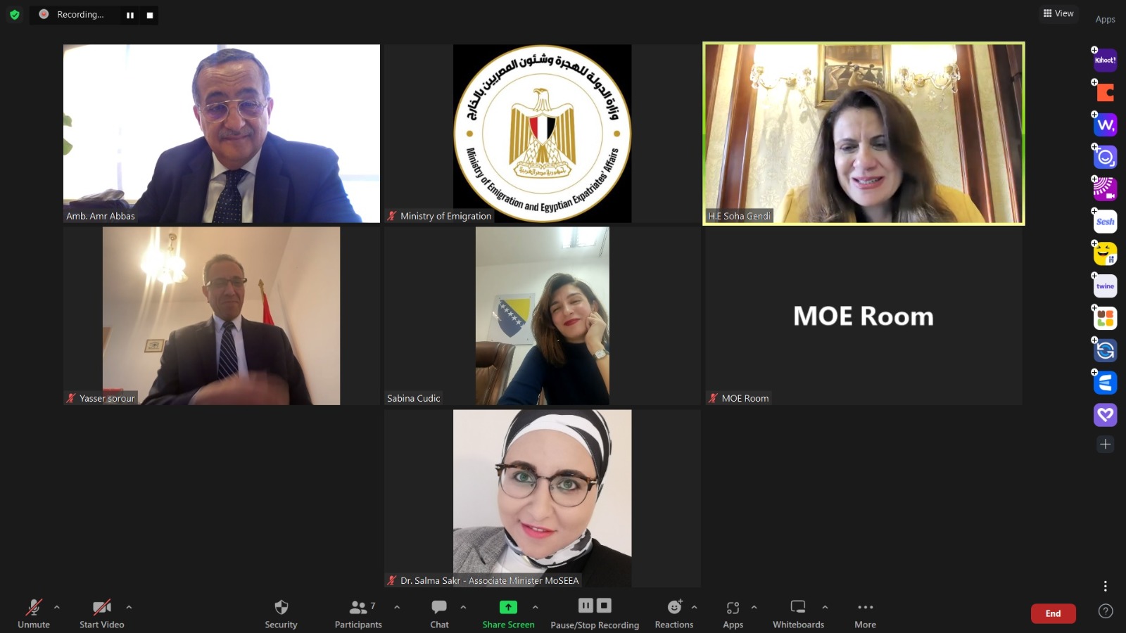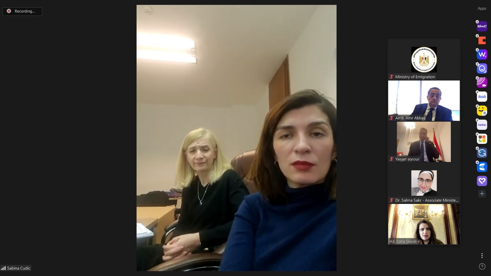 عقدت السفيرة سها جندي، وزيرة الدولة للهجرة وشئون المصريين بالخارج، لقاء عبر الفيديو كونفرانس، مع النائبة سابينا كوديتش عضو برلمان اتحاد البوسنة والهرسك ونائبة رئيس حزب "حزبنا" البوسني،