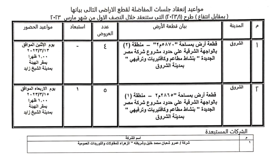 وحددت هيئة المجتمعات العمرانية يوم الأربعاء الموافق ١٥/ ٣ لعقد جلسة المفاضلة على قطعة أرض بمساحة "٢٨٦٥م٢" بالمنطقة (١) بالواجهة الشرقية على حدود مشروع شركة مصر الجديدة بنشاط مطاعم وكافتيريات وترفيهي وعدد العروض المطروحة لهذه الأرض ٥ عروض، مع استبعاد عرض واحد فقط وهو لشركة عمرو شعبان محمد خليل وشريكته الزهراء للمقاولات والتوريدات العمومية.