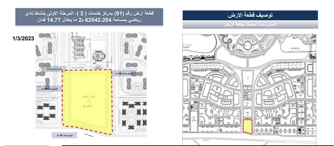 قطعة أرض رقم (91) بمركز خدمات (2)، المرحلة الأولى بنشاط نادي رياضي بمساحة 62042.204 م2 ما يعادل 14.77 فدان وسعرها التقديري 3810 جنيهات مصرية للمتر مربع.