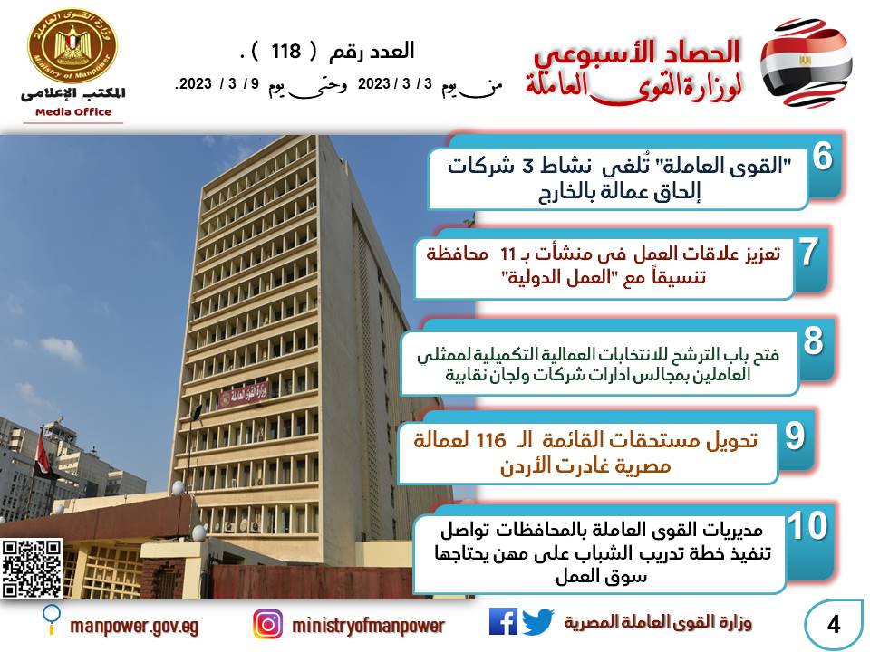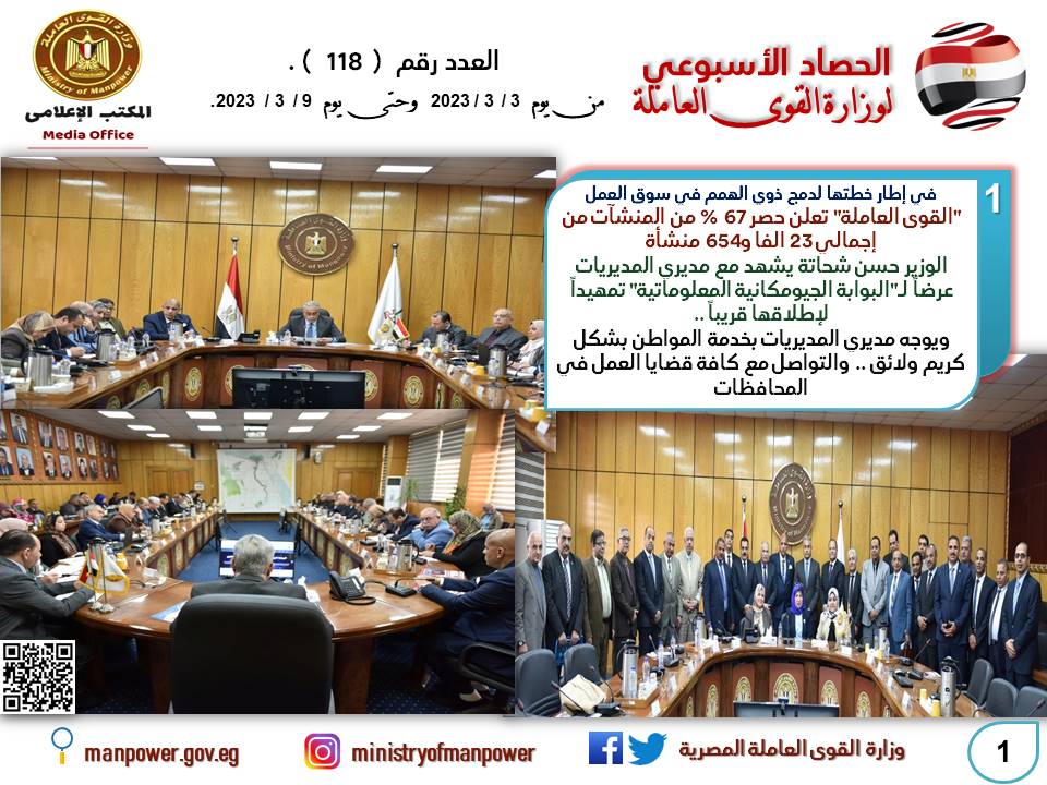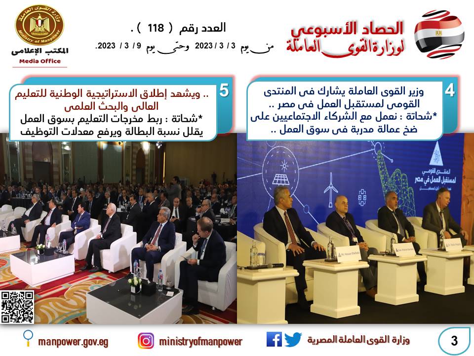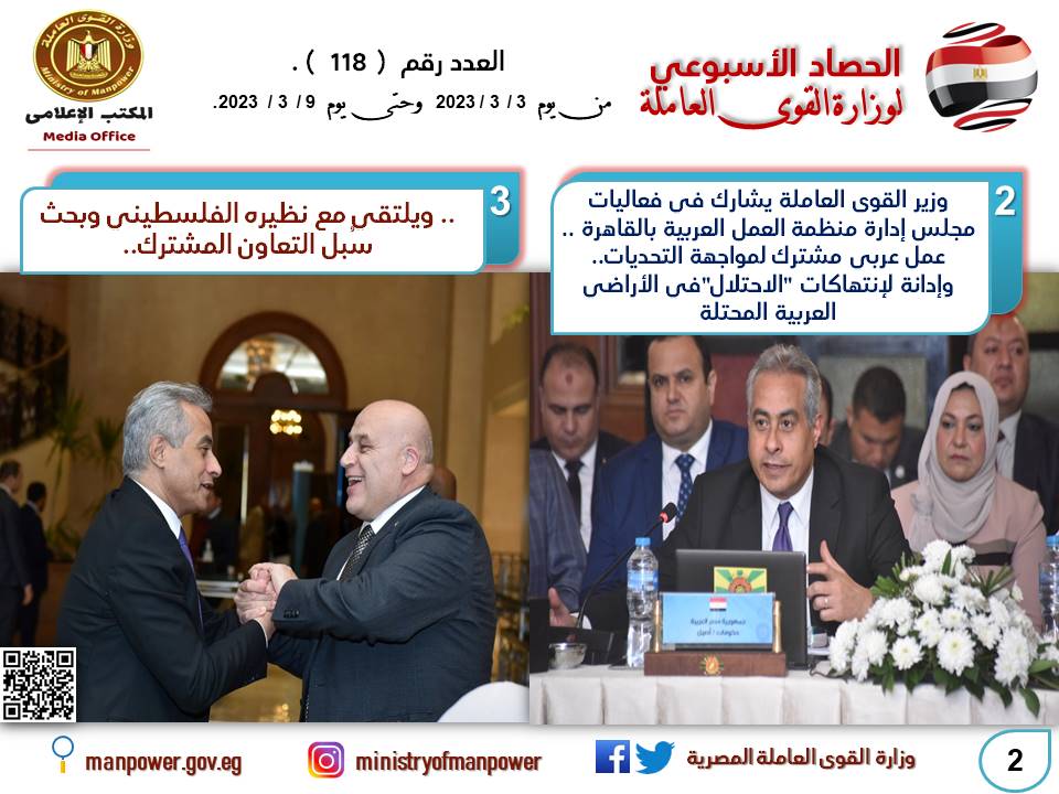 رصد "فيديو وإنفوجراف" صدر عن وزارة القوى العاملة اليوم الجمعة، الحصاد الأسبوعي للوزارة، خلال الفترة من 3 وحتى 9 مارس 2023، موضحًا أبرز أنشطة "الوزارة" في الـ7 أيام الماضية على المستوى المحلي والعربي والدولي.