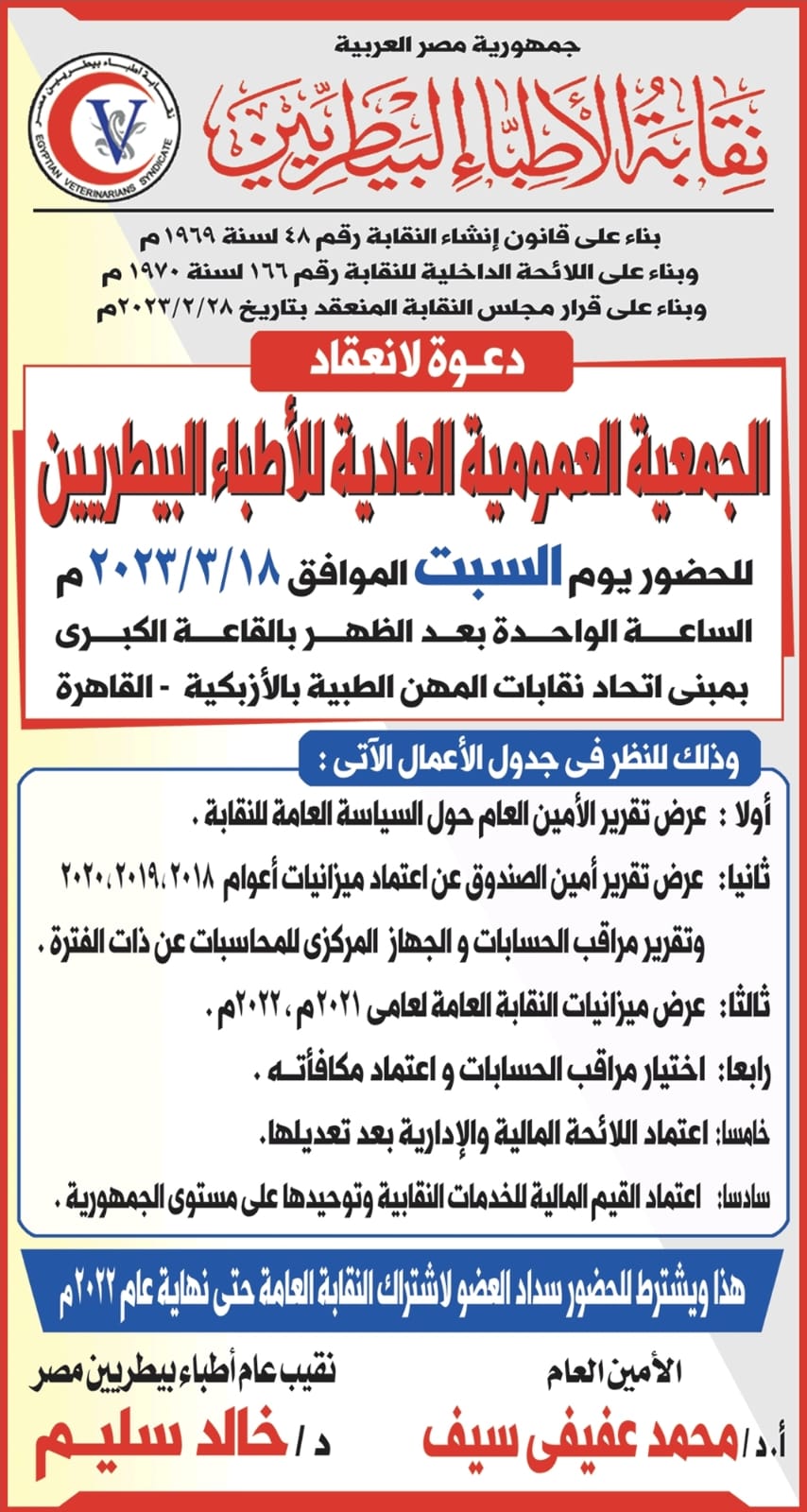أعلنت النقابة العامة للأطباء البيطريين، أنه بناء على قرار مجلس النقابة المنعقد بتاریخ 28/2/2023م، تقرر الدعـوة لانعقاد الجمعية العمومية العادية للأطباء البيطريين، يوم السبت الموافق 18/3/2023 م، الساعـة الواحـدة بعـد الظهـر بالقاعـة الكبـرى بمبنی اتحاد نقابات المهن الطبية بالأزبكية - القاهرة.