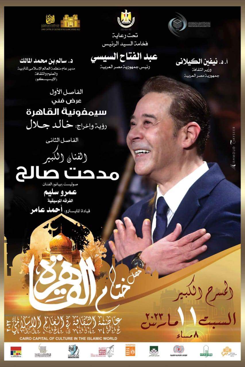 تشهد الدكتورة نيفين الكيلاني وزيرة الثقافة والدكتور سالم بن محمد المالك المدير العام لمنظمة العالم الإسلامي للتربية والعلوم والثقافة "الإيسيسكو"، حفل ختام أنشطة وفعاليات "القاهرة عاصمة الثقافة في دول العالم الإسلامي "، الذي يُقام بدار الأوبرا المصرية، في تمام السابعة من مساء غدا السبت الموافق 11 مارس الجاري.