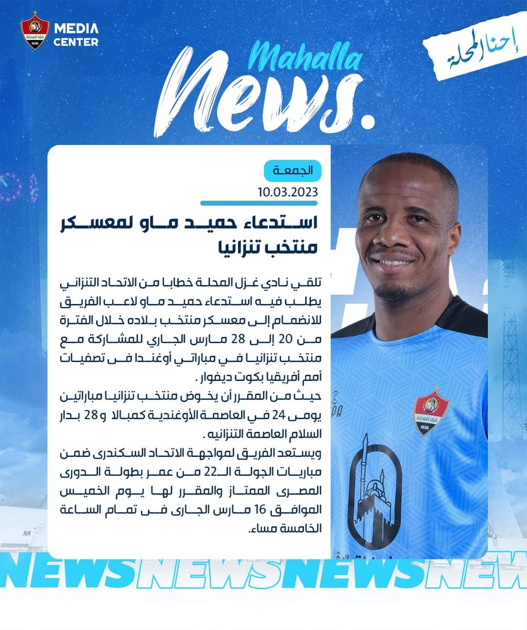 تلقي نادي غزل المحلة خطابا من الاتحاد التنزاني يطلب فيه استدعاء حميد ماو لاعب الفريق للانضمام إلى معسكر منتخب بلاده خلال الفترة من 20 إلى 28 مارس الجاري.