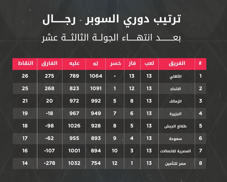 ويأتي جدول ترتيب الدوري قبل انطلاق الجولة الـ14 كالتالي: