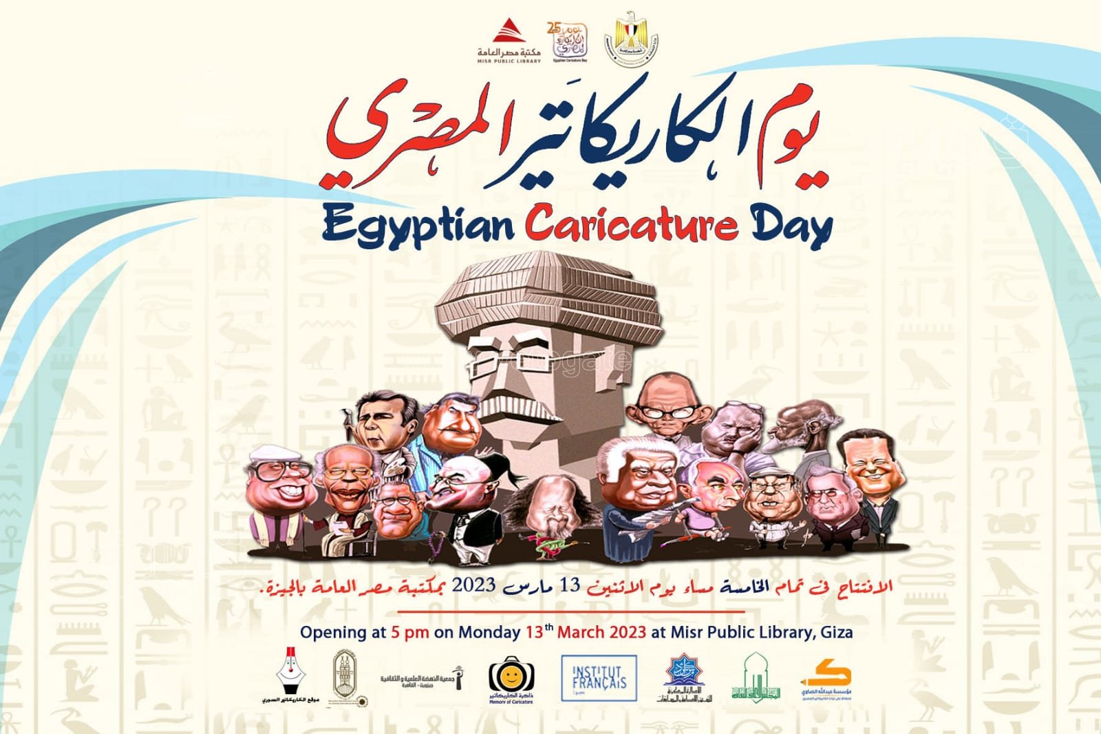 بمشاركة الدكتورة نيفين الكيلاني وزيرة الثقافة، يفتتح الفنان جورج البهجوري، والفنان: شريف عليش، بحضور السفير محمد رضا الطايفي مدير صندوق مكتبات مصر العامة، والدكتورة إيمان نجم رئيس الإدارة المركزية للشئون الأدبية والمسابقات بوزارة الثقافة، والدكتورة نهلة الصعيدي، مستشار شيخ الأزهر لشئون الوافدين، والباحث والكاتب: عبدالله الصاوي صاحب الفكرة والمنسق العام للاحتفالية، في الخامسة من مساء الاثنين المقبل 13 مارس، بمقر مكتبة مصر العامة بالجيزة، الدورة الأولى من احتفالية يوم الكاريكاتير المصري.