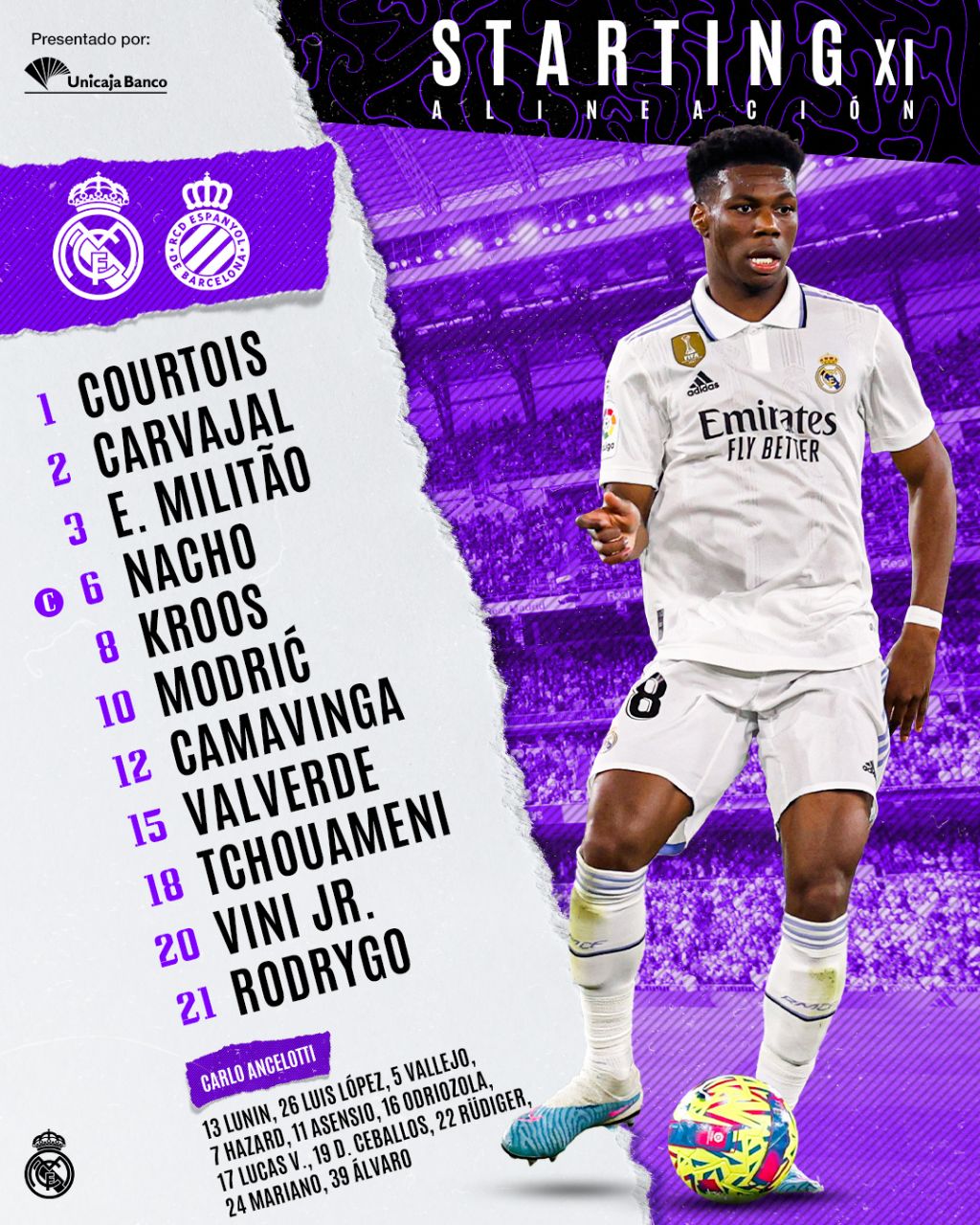 أعلن الإيطالي كارلو أنشيلوتي مدير فني ريال مدريد عن تشكيل فريقه لمواجهة إسبانيول في الجولة 25 من بطولة الدوري الإسباني، ويسعى ريال مدريد للفوز بالمباراة لتقليص الفارق مؤقتا مع المتصدر برشلونة حيث يحتل البرشا صدارة الليجا بفارق 9 نقاط عن المرينجي.