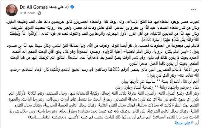 وكتب الدكتور علي جمعة، عبر صفحته بالفيس بوك، عن العلم في مصر فأوضح أن "مصر تميزت بوجود العلماء فيها منذ الفتح الإسلامي وإلى يومنا هذا، والعلماء المصريون كانوا حريصين دائما على العلم ومنهجه الدقيق، وكان من كبار علماء الصحابة عبد الله بن عمرو بن العاص، الذي عاش ومات في مصر، وتميز بدقة روايته للحديث النبوي الشريف"