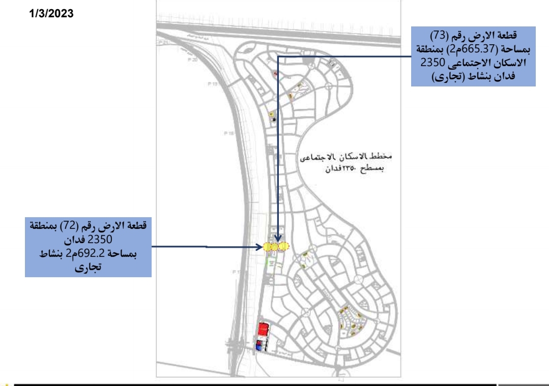 قطعة الارض رقم (72) بمنطقة 2350 فدان بمساحة 692.2م2 بنشاط تجاري وسعرها التقديري 17065 جنيه مصري للمتر مربع.