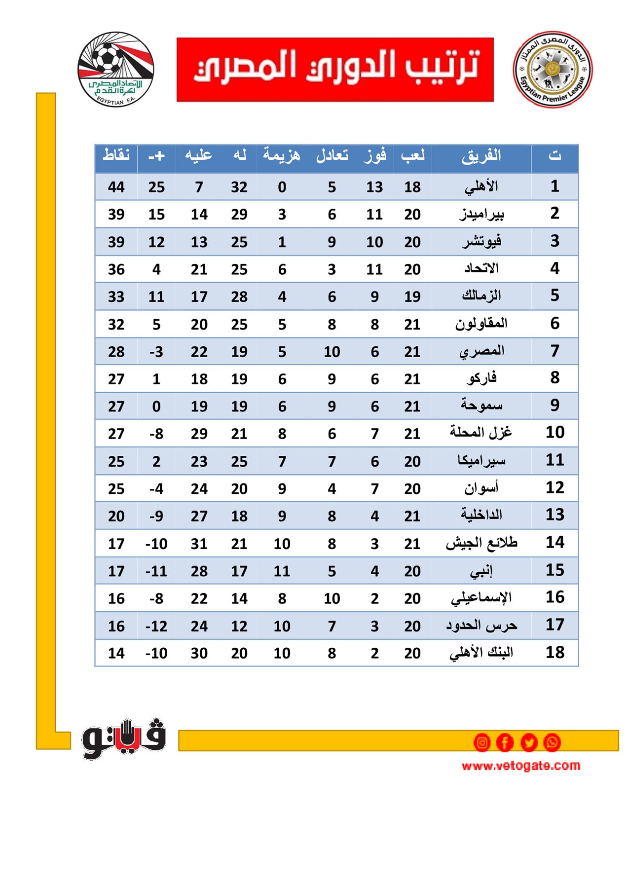 وجاء جدول ترتيب الدوري المصري قبل مباريات اليوم الأحد كالتالي