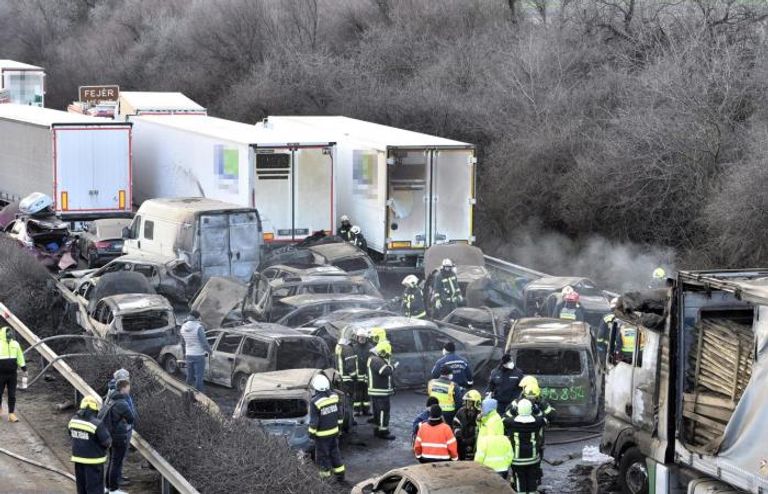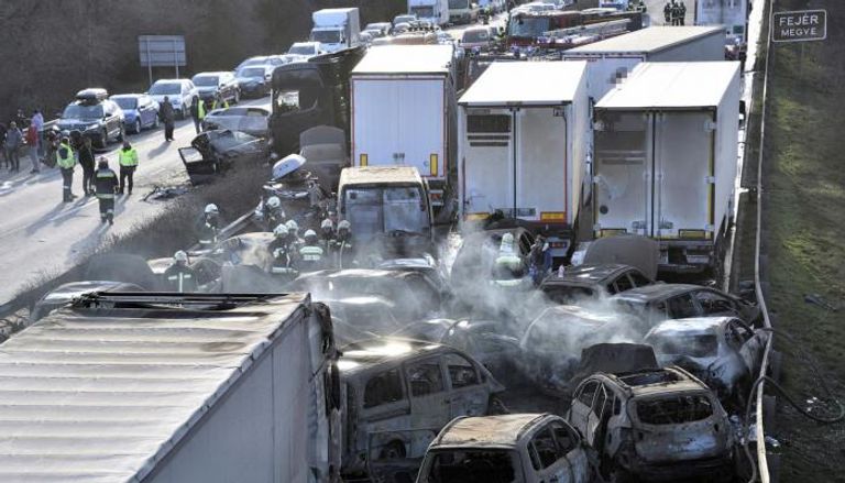 وجرى نقل المصابين للمستشفى. وقد وقع الحادث على طريق "إم وان" الذي يربط بوادبست بفيينا، بعدما ضربت عاصفة ترابية الطريق.