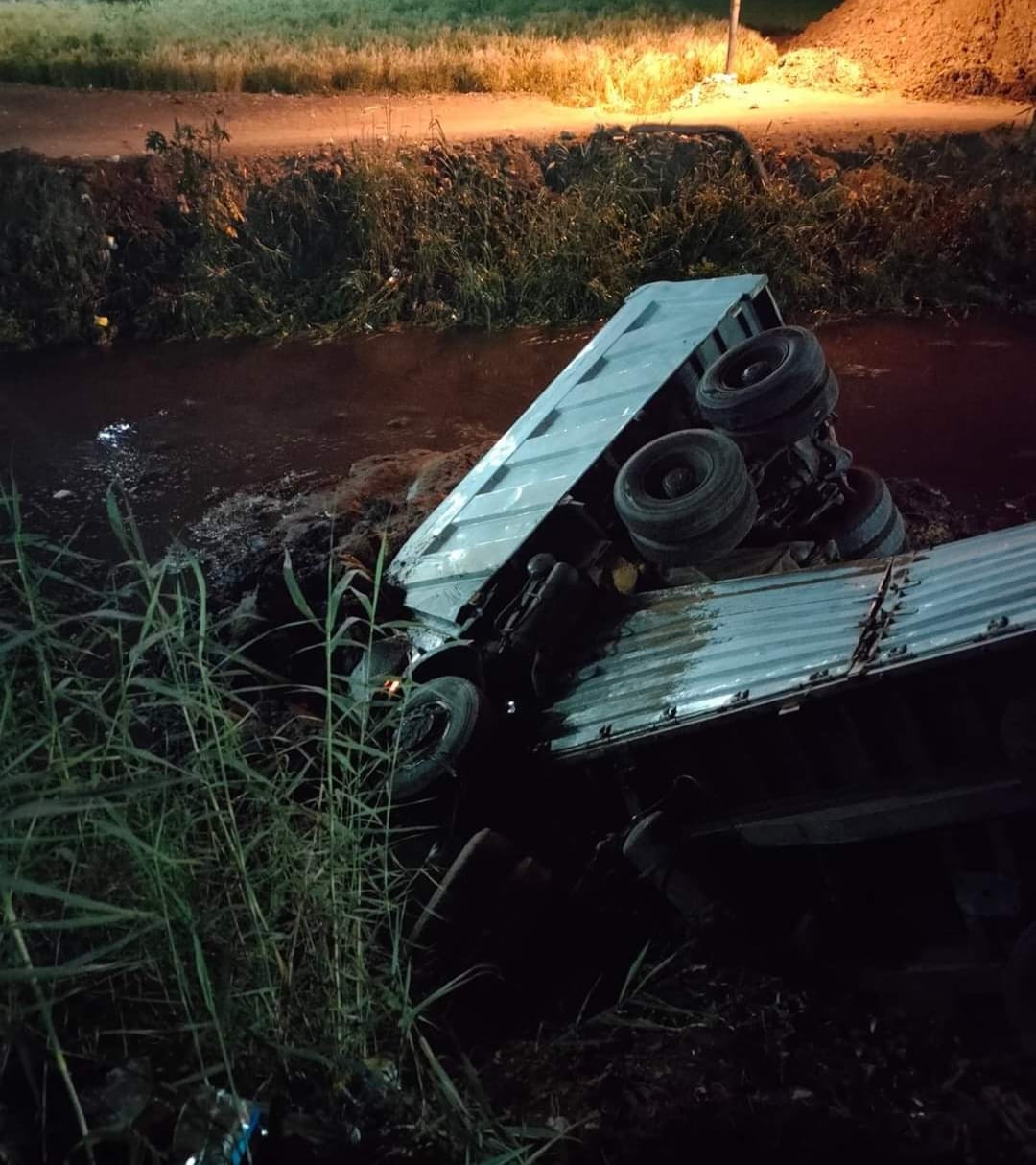 انقلاب تريلا في مصرف بالغربية، السائق قفز في المياه والتباع أصيب