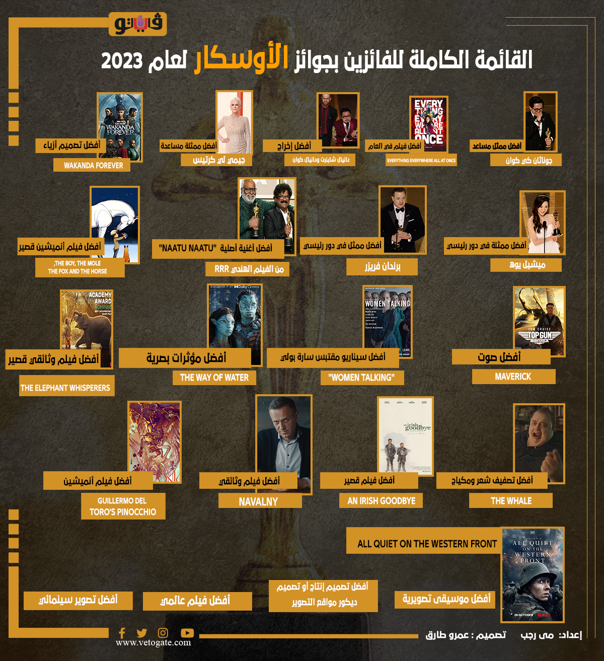 القائمة الكاملة للفائزين بجوائز الأوسكار لعام 2023 (إنفوجراف) الإثنين 13/مارس/2023 - 08:20 ص 3/13/2023 8:20:41 AM أوسكار 2023، فيتو مى رجب تصميم :عمرو طارق شارك طباعة 18 حجم الخط شارك طباعة Everything Everywhere All at Once أفضل فيلم اوسكار ٢٠٢٣ أوسكار أفضل ممثلة سينمائية 2023 جوائز أوسكار 2023 القائمة الكاملة للفائزين بالأوسكار ٢٠٢٣ أوسكار 2023