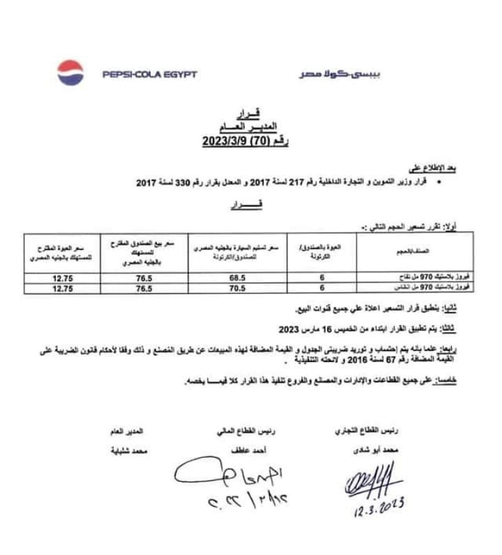 أسعار فيروز، أخطرت شركة المياه الغازية ببيبسي تجار المواد الغذائية بالقائمة الجديدة لأسعار مشروب فيروز والمقرر تطبيقها ابتداء من الخميس داخل الأسواق.
