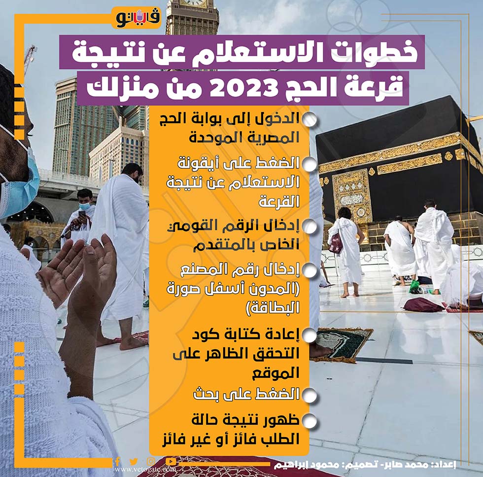 خطوات الاستعلام عن نتيجة قرعة الحج 2023 من منزلك (إنفوجراف) الإثنين 13/مارس/2023 - 09:20 م 3/13/2023 9:20:46 PM خطوات الاستعلام عن نتيجة قرعة الحج 2023، فيتو محمد صابر شارك طباعة 18 حجم الخط شارك طباعة نتيجة قرعة الحج نتيجة قرعة الحج 2023 قرعة الحج 2023 حج 2023 بوابة الحج المصرية الاستعلام عن نتيجة قرعة الحج 2023