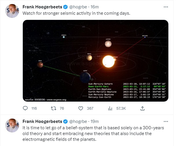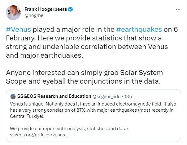 وقال فرانك هوجربتس: " لعب كوكب الزهرة دورًا رئيسيًا في الزلازل في 6 فبراير. نقدم هنا إحصائيات توضح وجود علاقة قوية لا يمكن إنكارها بين كوكب الزهرة والزلازل الكبرى. يمكن لأي شخص مهتم ببساطة الحصول على نطاق النظام الشمسي وقياس الاقترانات في البيانات"