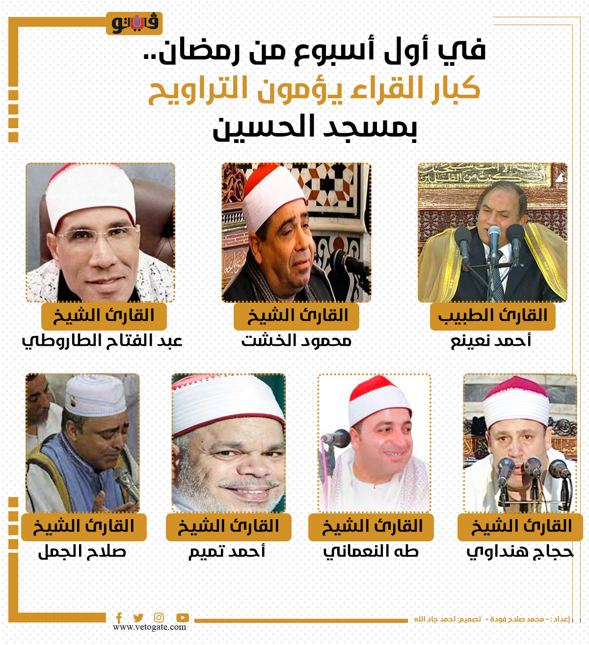 في أول أسبوع من رمضان.. كبار القراء يؤمون التراويح بمسجد الحسين (إنفوجراف) الأربعاء 15/مارس/2023 - 12:31 م 3/15/2023 12:31:10 PM قراء صلاة التراويح بمسجد الحسين، فيتو - محمد صلاح فودة شارك طباعة 18 حجم الخط شارك طباعة 1- القارئ الطيبب أحمد نعينع 2- القارئ الشيخ محمود الخشت 3- القارئ الشيخ عبد الفتاح الطاروطي 4- القارئ الشيخ حجاج هنداوي 5- القارئ الشيخ طه النعماني 6- القارئ الشيخ احمد تميم 7- القارئ الشيخ صلاح الجمل