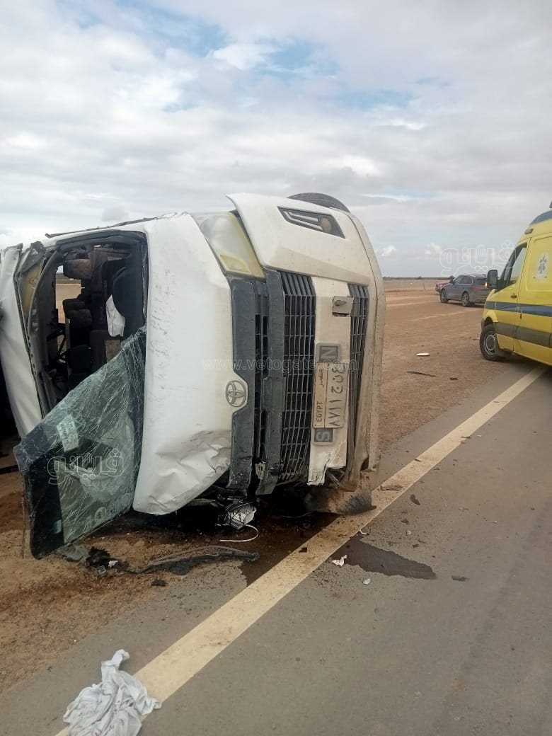 أصيب 8 أشخاص، اليوم الثلاثاء، إثر حادث تصادم سيارة ميكروباص مع سيارة ربع نقل بطريق العلمين وادي النظرون، ناحية الكيلو 25.