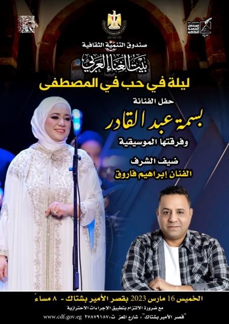 يستضيف بيت الغناء العربي بقصر الأمير بشتاك، والتابع لقطاع صندوق التنمية الثقافية في السابعة من مساء الخميس المقبل الموافق 16 مارس الجاري، حفل غنائي للفنانة بسمة عبد القادر وفرقتها الموسيقية.