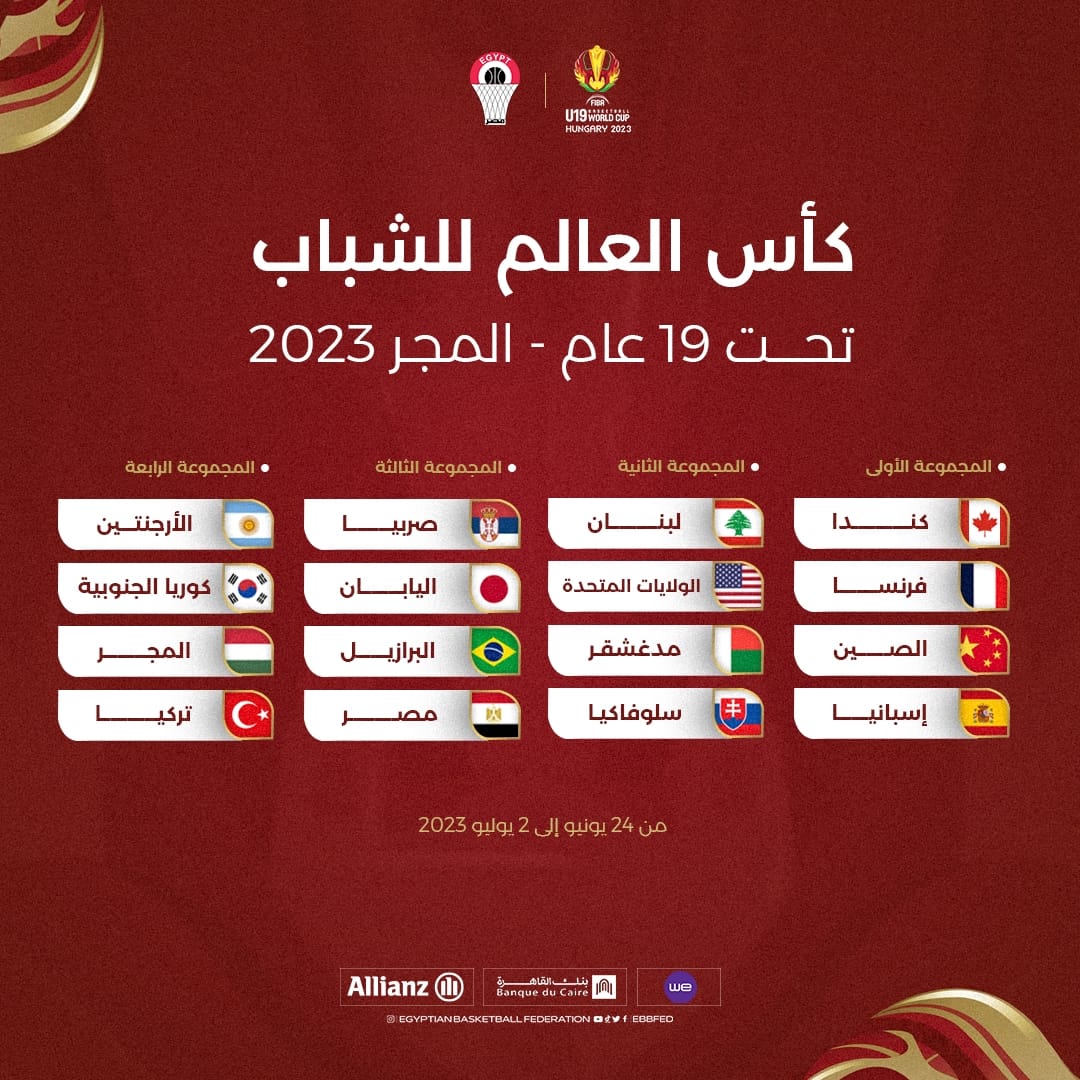 كرة السلة، أجرى الاتحاد الدولي لكرة السلة "فيبا" قرعة كأس العالم لمنتخبات الشباب تحت 19 عام المقرر اقامتها في المجر خلال الفترة من 24 يونيو إلى 2 يوليو من العام الجاري.