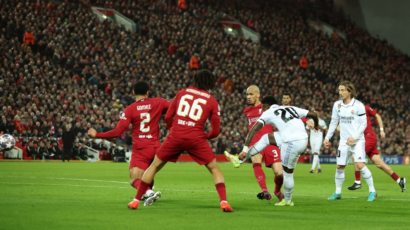 وفاز ريال مدريد ذهابًا، على ملعب آنفيلد، بنتيجة 5-2.