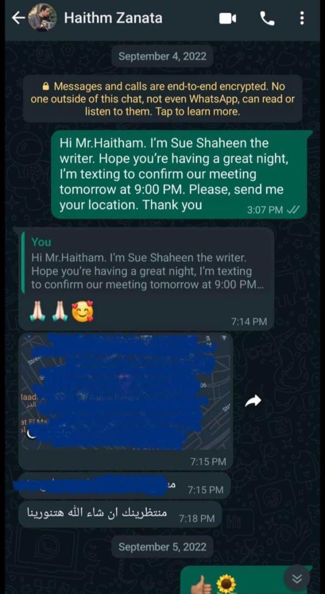 وأضافت: "أرسلت لها معالجة أولية للمسلسل عبر الإيميل، وخلال وقتٍ قصير جدًّا، تلقيت ردًّا من مكتبها بأنّ غادة عبد الرازق ترغب في مقابلتي، للاطلاع على الفكرة بشكلٍ أكبر وأشمل، لإعجابها الشديد بالموضوع، ووقتها ومن خلال الشخص الوسيط، تواصلت مع زوجها هيثم زنيتا، بخصوص ترتيب اللقاء، وبالفعل أرسل لي عنوان المنزل والموعد".