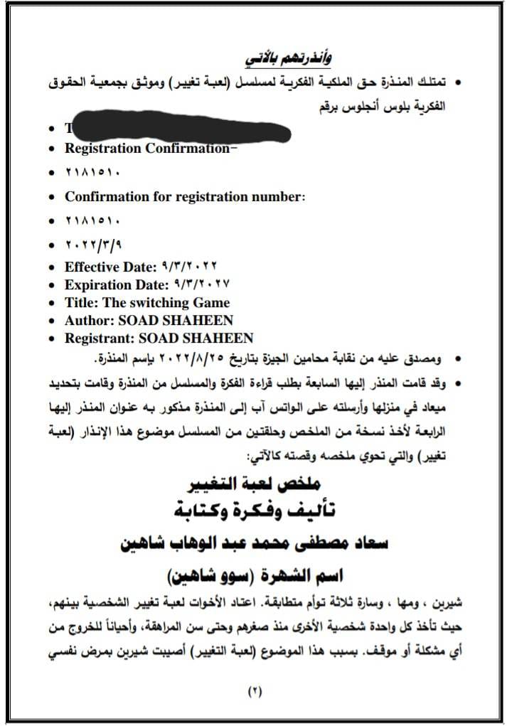 وأوضحت سوو شاهين المُقيمة بأمريكا، لـ “ET بالعربي” تفاصيل اتهامها صُنَّاع "تلت التلاتة" بسرقة الفكرة والتي تحمل اسمًا أوليًّا "لعبة التغيير"، موضحة أنها تواصلت مع غادة عبد الرازق قبل 8 أشهر تقريبًا، أثناء بحث غادة عن فكرة مسلسل تُشارك به في موسم رمضان 2023، قائلة: "كان فيه شخص وسيط بيني وبينها، وشرح لي وقتها أنّ غادة بتبحث عن فكرة كويسة يصلح تقديمها لمسلسل مكون من 30 حلقة، بالفعل تحمست للموضوع، وتواصلت معها بعدما سجلت الفكرة في إحدى الجهات بأمريكا، وكذلك في مصر أيضًا، من منطلق حماية الملكية الفكرية".