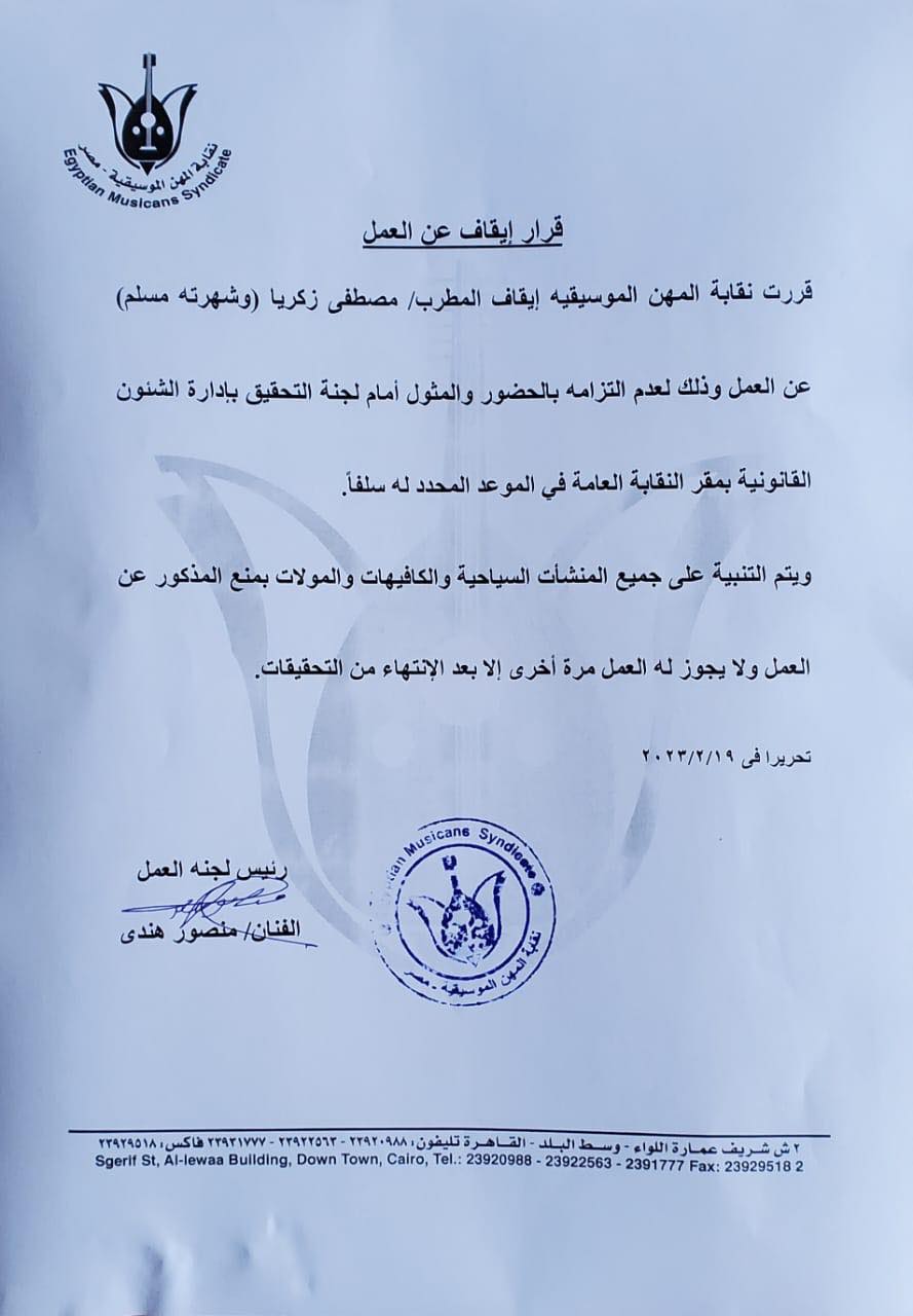 وقالت النقابة في بيانها: قررت نقابة المهن الموسيقية، برئاسة الفنان مصطفى كامل، إيقاف مطرب المهرجانات مصطفى زكريا الشهير بـ مسلم، وذلك لعدم مثوله لتحقيق النقابة في موعده المحدد الأحد الماضي، بسبب الشكوى المقدمة من منتجه سلطان الشن.