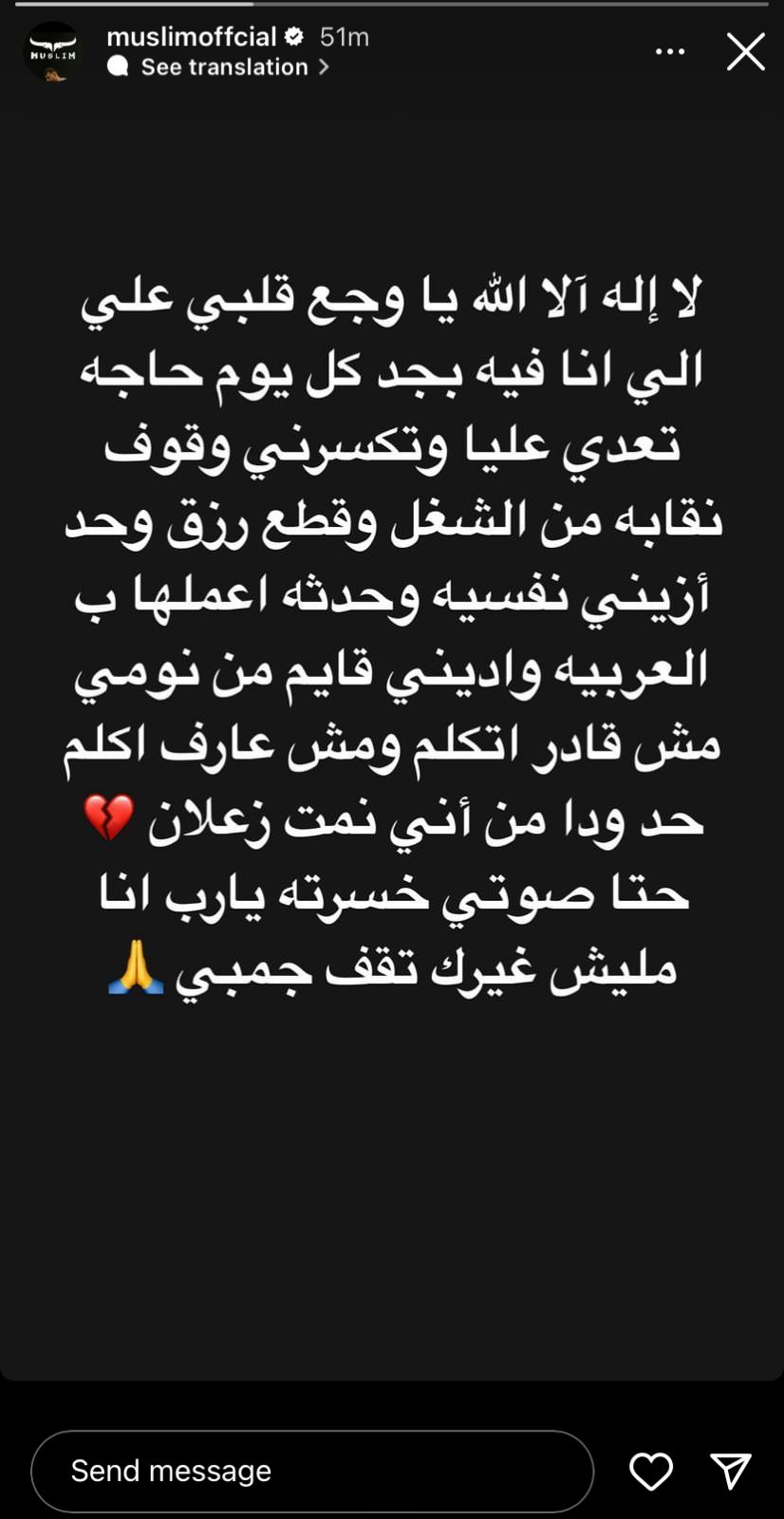 وكتب مسلم منشورًا عبر حسابه الشخصي بانستجرام: لا إله إلا الله يا وجع قلبي على اللي أنا فيه، بجد كل يوم حاجة تعدي عليا وتكسرني.. وقوف النقابة من الشغل وقطع رزق وحد أذاني نفسيا، وحادثة أعملها بـ العربية، واديني قايم من نومي مش قادر اتكلم ومش عارف أكلم حد، وده من أني نمت زعلان، حتى صوتي خسرته يارب أنا مليش غيرك تقف جنبي.