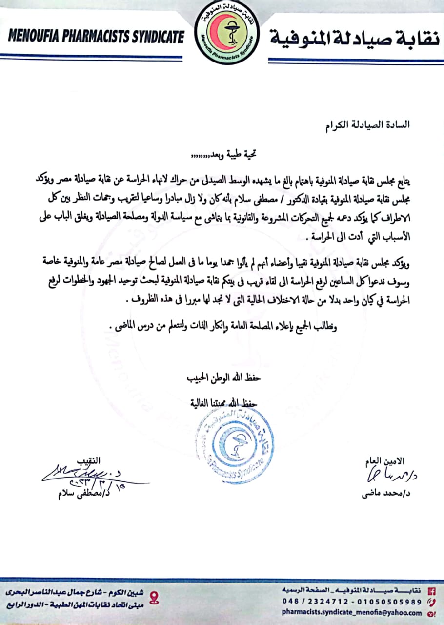أصدر مجلس نقابة صيادلة المنوفية بيانًا رسميًا يخاطب صيادلة مصر وجمعيتهم العمومية أعضاء نقابة الصيادلة بالمنوفية، عن موقف المجلس من الحراك القائم بشأن إنهاء الحراسة عن نقابة صيادلة مصر.