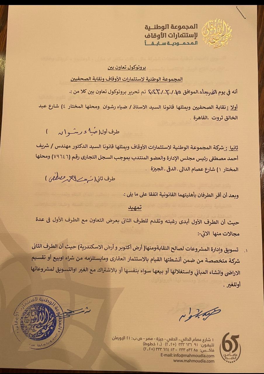 مبينا، أنه تم التوقيع اليوم بين النقيب ضياء رشوان ممثلا للنقابة، ومحمد شبانة وكيل النقابة ورئيس لجنة الإسكان وبين الدكتور شريف أحمد مصطفى رئيس مجلس إدارة الشركة