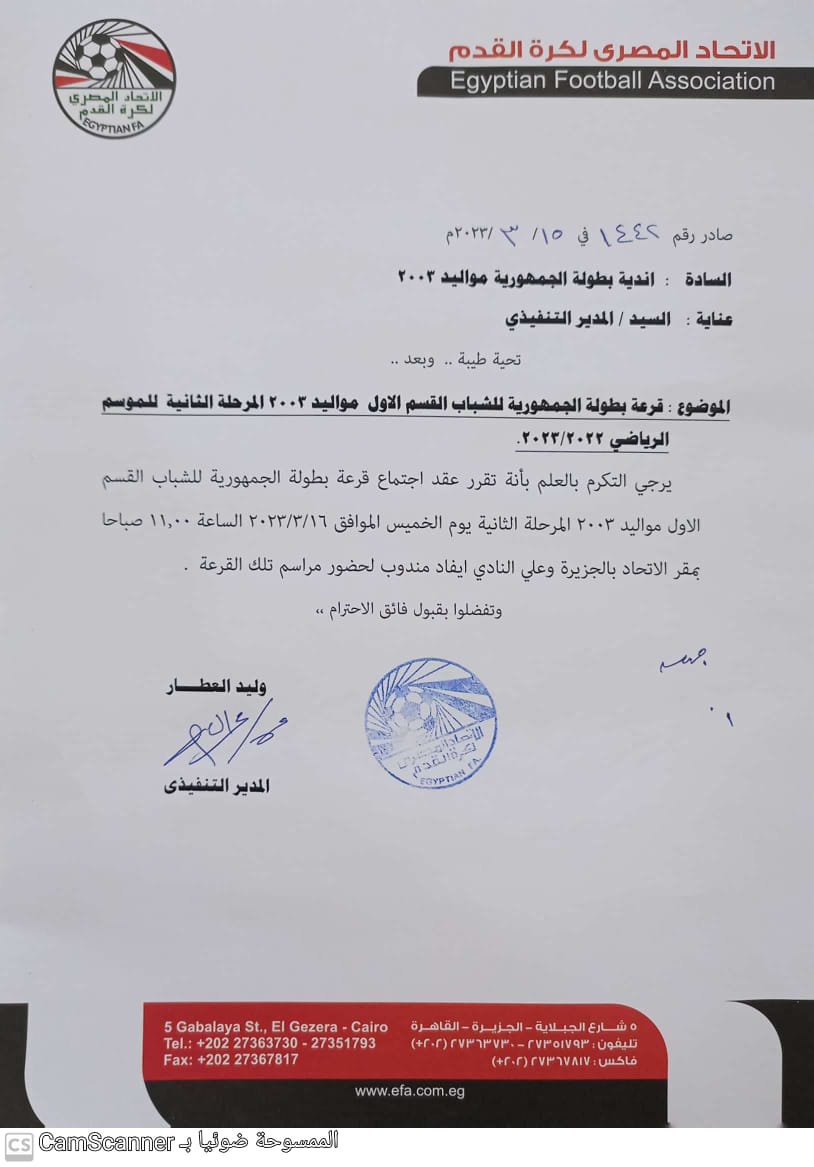 وأخطر اتحاد الكرة الأندية المشاركة بموعد إجراء قرعة المرحلة الثانية لمسابقة دوري الجمهورية للشباب 2003.
