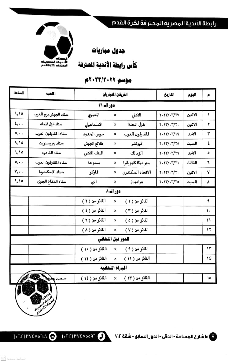 أسفرت قرعة بطولة كأس الرابطة التي سحبت اليوم الثلاثاء بمقر اتحاد الكرة عن مواجهات قوية في دور الـ16 وجاءت نتائجها كالتالي: