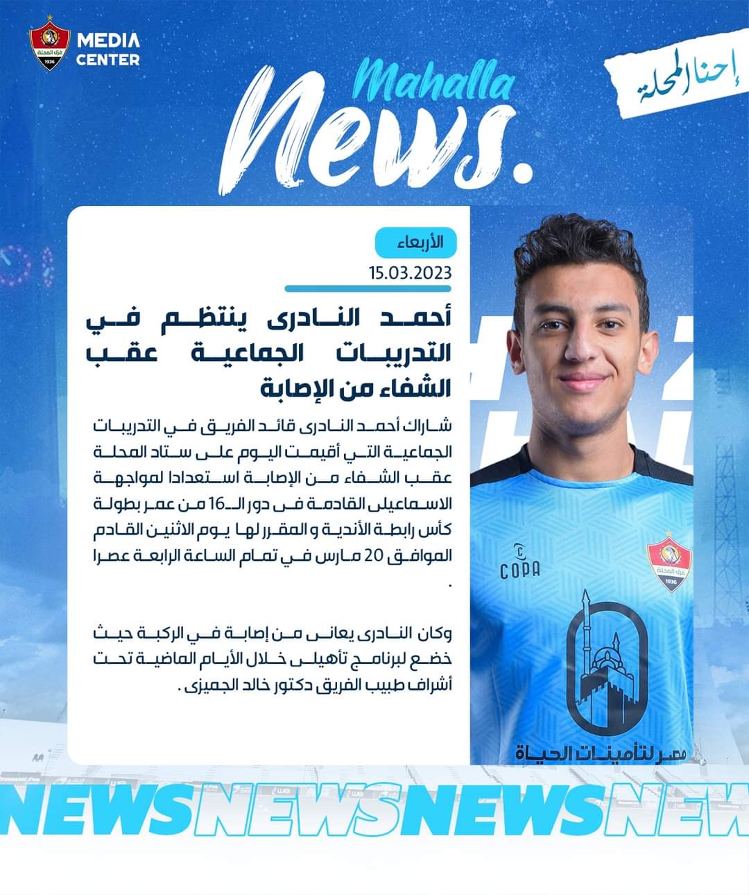 شارك أحمد النادرى قائد الفريق في التدريبات الجماعية التي أقيمت اليوم على ستاد المحلة عقب الشفاء من الإصابة، استعدادا لمواجهة الاسماعيلى القادمة فى دور الـ16 من عمر بطولة كأس رابطة الأندية والمقرر لها يوم الاثنين القادم الموافق 20 مارس في تمام الساعة الرابعة عصرا.
