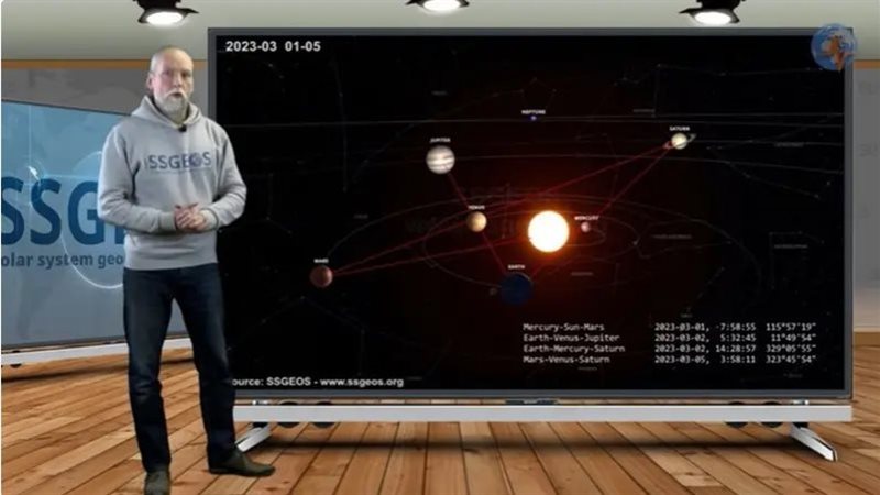 وفي أحدث توقعاته، اليوم الأربعاء، أعاد هوجلربيتس التغريد برسم بياني وقال إنه "تم ذكر بعض الهندسة الحرجة في 13 (من مارس). وهي تتضمن هندسة عطارد والزهرة (القمم الحمراء / البنفسجية) مجتمعة.